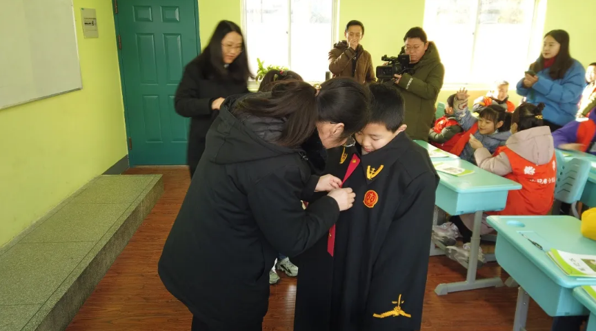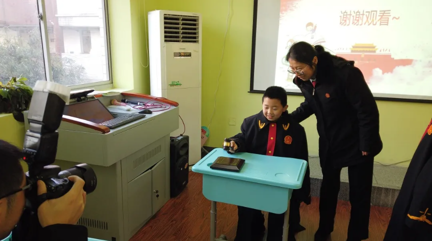 民一庭还为小记者、小主播带去了法袍及法槌,同学们积极踊跃试穿法袍、敲击法槌,体验一名小“法官”的快乐。