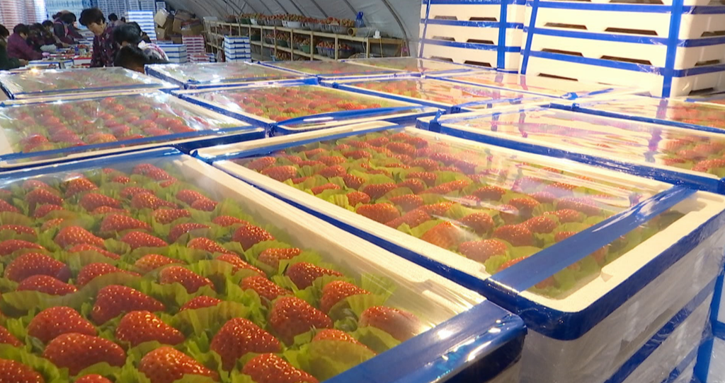 “我们现在直接跟大超市合作,不跑市场,不经过供应商,从产地源头直接到公司,天气正常的情况下,一天的量在8000斤到一万斤。”分拣中心现场负责人张波介绍。分拣中心将汇总到这里的草莓按照大小分类包装,集中送往上海等地的水果超市。“因为草莓属于时鲜货,保存周期只有两三天的时间,而我们园区种植面积大,产量多,因此直送商超减少了流通环节,不用担心草莓的保存,保证了种植户的利益。”滨江现代农业科技产业园办公室负责人王召峰介绍。