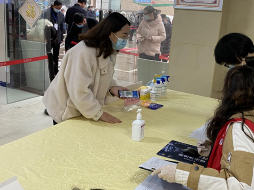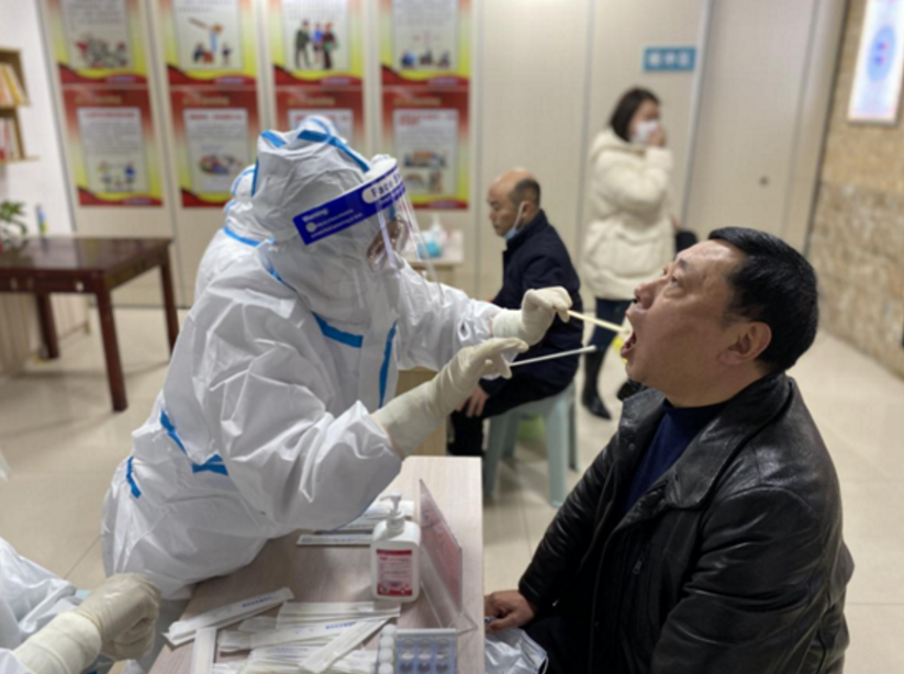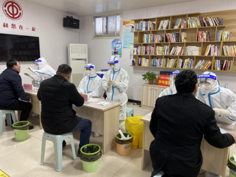 登记环节:待检人员在工作人员的引导下,扫描“健康码+行程码”,体温测量、做好身份信息登记后,凭工作人员提供的核酸检测试剂进入采样区,按照规范进行咽拭子采样。