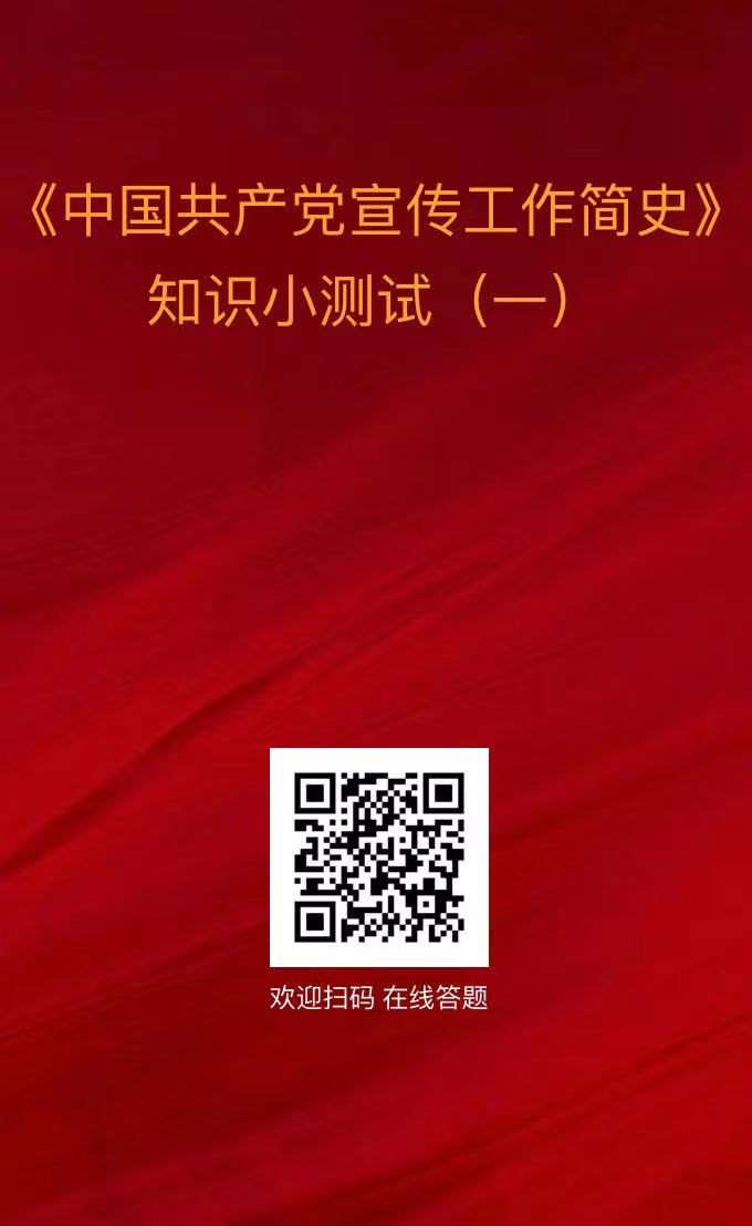 为深入学习《中国共产党宣传工作简史》,推动党员群众全面了解党的宣传史上重要思想、重要方针、重要事件、重要活动,进一步深刻认识“两个确立”的决定性意义,增强“四个意识”、坚定“四个自信”、做到“两个维护”,特开设“《中国共产党宣传工作简史》知识小测试”栏目,欢迎广大读者积极扫码参与答题。