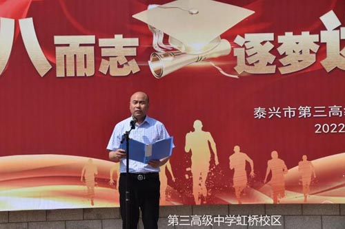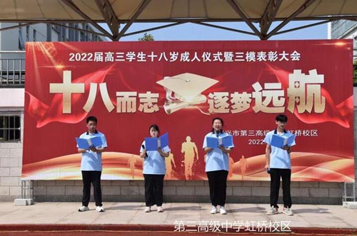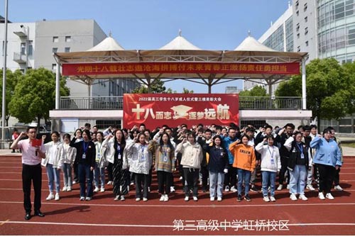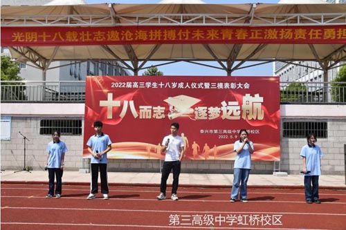 学生宣誓 4.泰兴市第三高级中学虹桥校区 5月9日上午,泰兴市第三高级中学虹桥校区举行了简朴而温馨的十八岁成人礼。