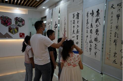 为迎接党的二十大胜利召开,培养青少年的爱国情怀。8月15日下午,在延令街道越街社区新时代文明实践站,社区书法爱好者和文艺志愿者们,开展了一场以“喜迎二十大”为主题的书法展活动。 书法爱好者们精心选送了一批书写热爱家乡、热爱祖国的书法作品进行了集中展示。越街社区实践站邀请辖区部分青少年参观了书法作品,书法老师带领小朋友们欣赏一幅幅作品,每件作品主题鲜明、风格多样,各展艺术之长。