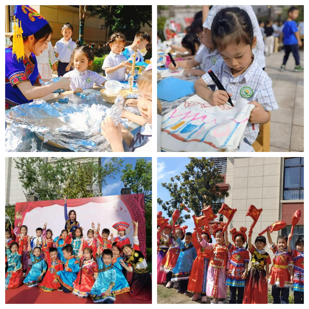 展·民族风情 小朋友用多种民族元素制作包包、首饰,身穿民族服装,面带微笑,饱含深情,用舞蹈、歌声礼赞祖国,向伟大的祖国送上节日祝福。
