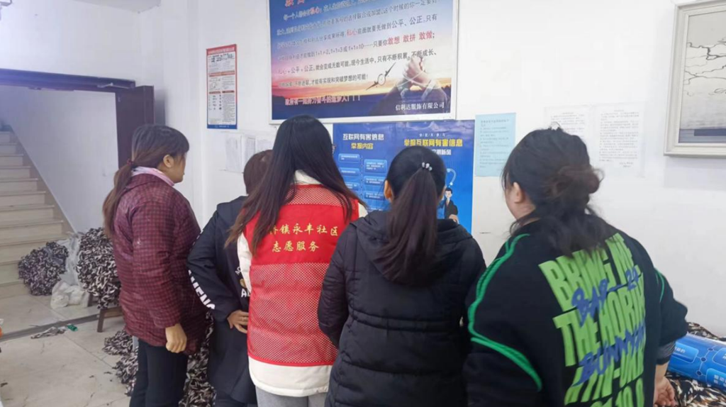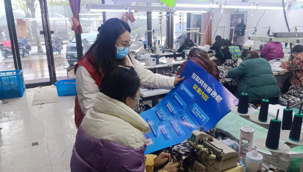 为引导广大人民群众践行网络文明规范,提升网络文明素养,共建共享天朗气清的网络精神家园,黄桥镇组织开展“e起护网”有害信息举报进企业宣传志愿服务活动,通过设立咨询点、发放宣传海报、手把手指导、知识讲座等形式普及网络违法和有害不良信息举报知识,广大群众纷纷点赞、认真学习,有力营造全民举报不良信息浓厚氛围。 活动第一站来到黄桥镇区服装厂企业。志愿者到企业中向员工讲解网络违法和有害不良信息举报方法,可通过关注“泰州市互联网违法有害不良信息举报中心”小程序,或拨打0523-87760330等途径举报涉及赌博、色情、谣言、侵权、暴恐等有害信息,手把手教大家进行网络举报,并强调网络安全的重要性。