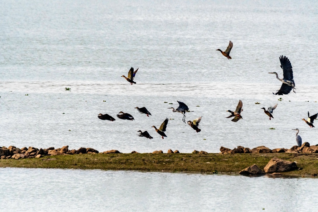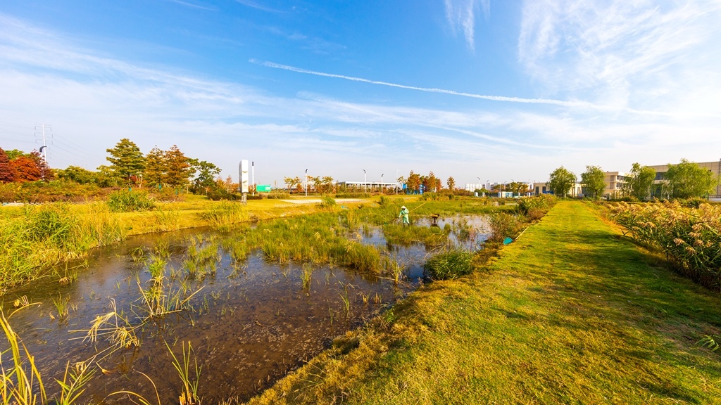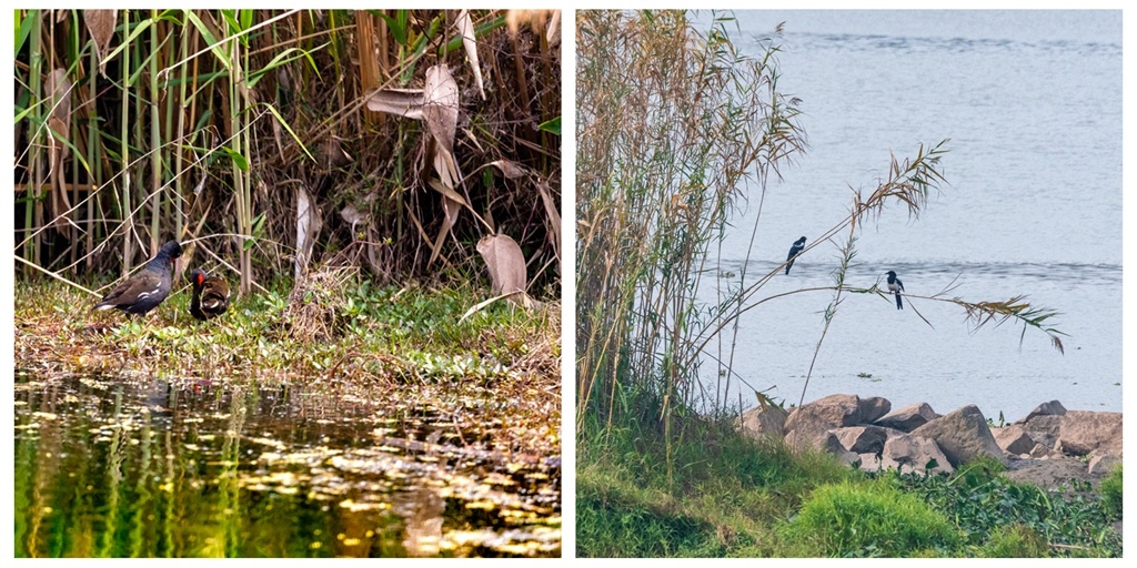 尾水进湿地,涵养共生好生态 飞越长江江堤和廊道,我们进入泰兴经济开发区。这是一个特别的家园——泰兴经济开发区尾水净化生态湿地。这里,芦苇随风摇曳,旁边的树上不时飞出“小伙伴”灰喜鹊,而湿地西边中沟的河坡上,大家时而飞起,时而憩息,中沟里还有野鸭在嬉戏…… 既要绿水青山,也要金山银山。泰兴经济开发区“关停并转”传统化工产业,依靠科技进步,加速绿色转型。2020年泰兴市在拆除厂房修复地块上规划建设230亩尾水湿地,目前已投入1.1亿元建成80亩。