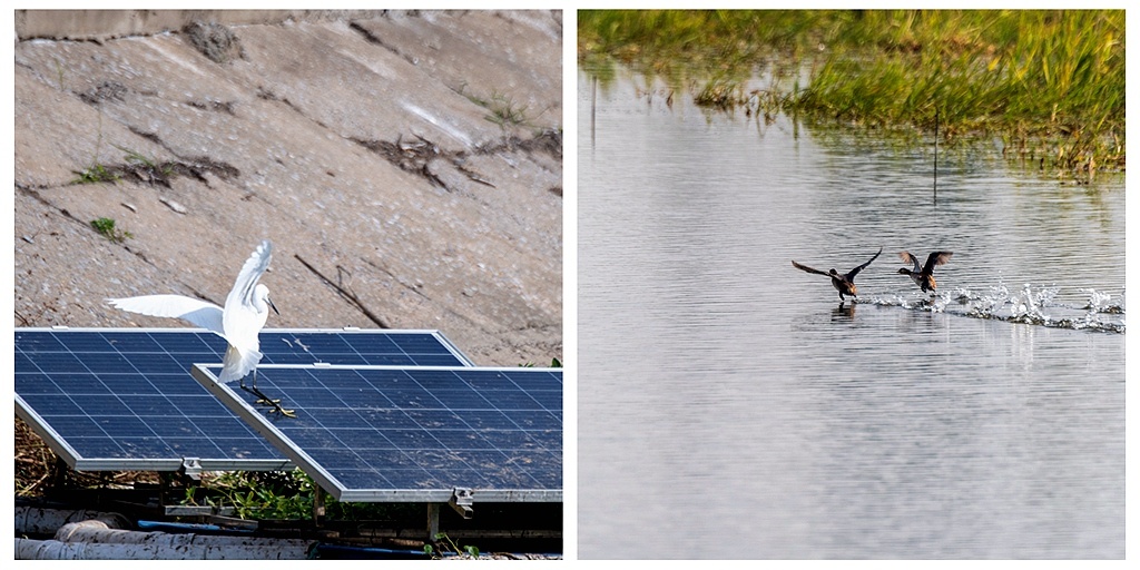 作为一只白鹭,没想到,我还能与“神奇”的太阳能板共沐阳光,与水草共“舞”其上。人们利用太阳能发电,给水体曝气增氧,大幅度提高河道水质。“浮岛”上还种着水草,引来我和喜鹊、鹧鸪等小伙伴们起起落落,形成“和谐共生”特色景观。