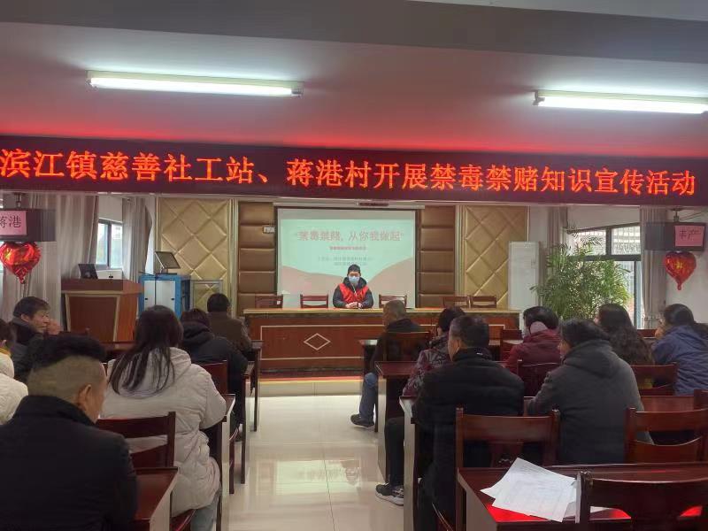为进一步预防和遏制赌博、吸毒等违法犯罪行为,切实增强全民守法意识,有效净化社会风气,正确引导辖区居民群众远离赌场、预防毒品。2023年2月23日上午,滨江镇慈善社工站联合滨江镇蒋港村新时代文明实践站,开展了以“禁毒禁赌,从你我做起”为主题的专题讲座。