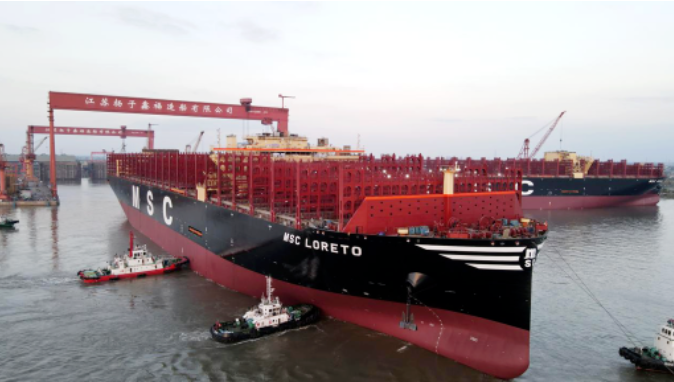 近日,在长江黄金岸线上,一艘红色涂装、黑色流线型船体、船身印有MSC标记的超大型集装箱船鸣响汽笛顺利出坞! 这是今年以来江苏扬子鑫福造船有限公司为交银租赁、地中海航运(MSC)建造的第三艘24000TEU超大型集装箱船,也是目前全球载重量最大装箱量最大的新一代超大型集装箱船型。