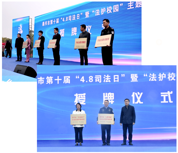 为全面贯彻落实党的二十大精神,深入学习贯彻习近平法治思想,4月8日,泰兴市举行第十届“4.8司法日”暨“法护校园”主题活动启动仪式。 现场为全市分区域成立的5个学校法治教育“微联盟”和2家公益护校组织授牌,相关普法单位签订了“法护校园”承诺。