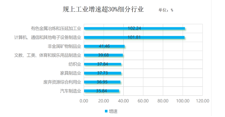 从规上工业看,化工及新材料、机电、医药、轻纺、农副产品加工等五大产业用电量全线飘红,有色金属冶炼和压延加工业、电子设备制造业、非金属矿物制品业、文教工美体育和娱乐用品制造业、纺织业、家具制造业、废弃资源综合利用业、汽车制造业等8个细分行业均出现35%到102%不等的增幅。 |