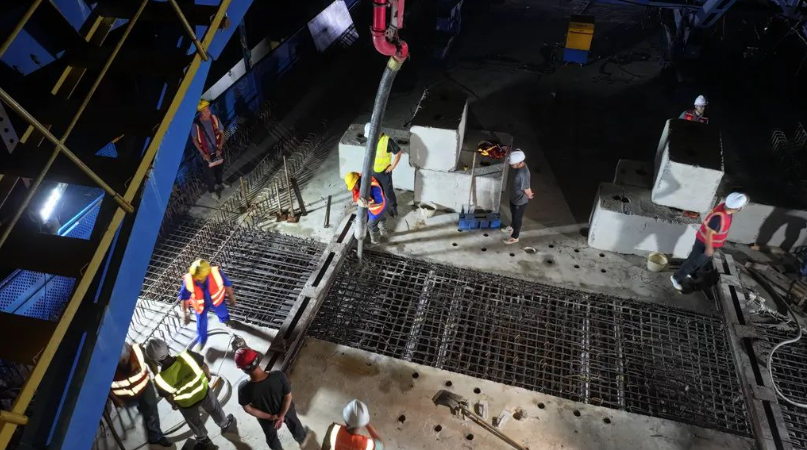 7月15日,由中铁十一局承建的沪渝蓉高铁(北沿江高铁)泰兴段内,第一座连续梁完成合龙。23点18分,随着一阵喜庆的烟花爆竹声响起,沪渝蓉高铁通泰扬特大桥跨规划S504连续梁开始合龙。施工现场,数十名工人各司其职,紧密配合。在施工人员的精准操控下,搅拌好的混凝土源源不断地被注入施工处。现场技术负责人告诉小编,之所以选在夜间11点多进行施工,主要是出于对施工要求的考虑。连续梁合龙段浇筑,需要在一天中温度最低时施工,以保证施工的质量和效率。