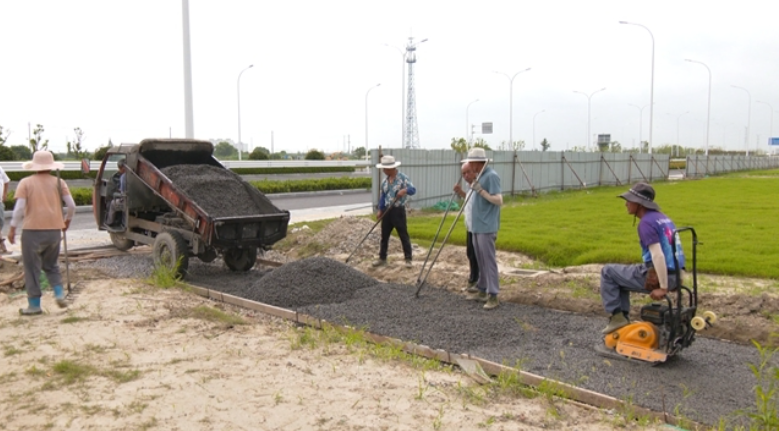 7月26日上午,在镇海路南延绿化工程城区段,施工人员正在进行园路路基平整、压实以及基层透水混凝土浇筑。截至目前,香樟、榉树、樱花等乔木栽植已完成30%以上,城市驿站主体结构施工已经完成。城区段绿化工程北起334省道,南至前汤河,长约1.3公里,按城市绿化标准建设,苗木品种丰富,做到四季景观鲜明有特色,造型别致有格调。绿地内将新建一条宽约3米,长约3.4公里的慢行步道以及长约2.2公里的滨水步道,并配套建设公厕、停车场、景观雕塑以及五人制足球场、篮球场、健身广场、乒乓球场等设施。“我们将抢抓工期进行园路、城市驿站、景观廊架的施工,待气温合适时,展开大规模乔灌木栽植,全力提升城市南大门形象。”泰兴市交通产业集团项目管理公司项目负责人何康说。