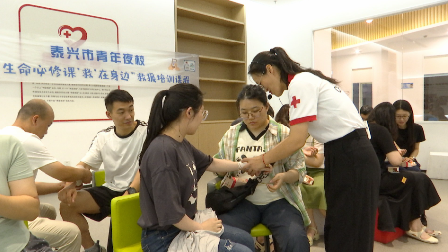 7月22日晚上7点,在泰兴市新时代文明实践中心,20多名“青年夜校”学员正在学习急救包扎技能,他们来自养老、医疗、教培等“一老一小”相关服务行业。