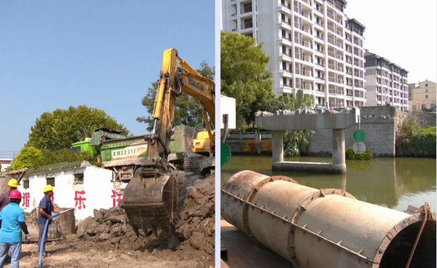 在前园路项目现场,施工人员正在拆除老旧的张立桥,为桥梁原址重建做准备。张立桥建成于2003年,老桥栏杆破损,宽度不足,高峰时段易交通拥堵。这次改造,将道路拓宽至12米,设置2幅机动车道、2幅人非混行车道,重建张立桥。