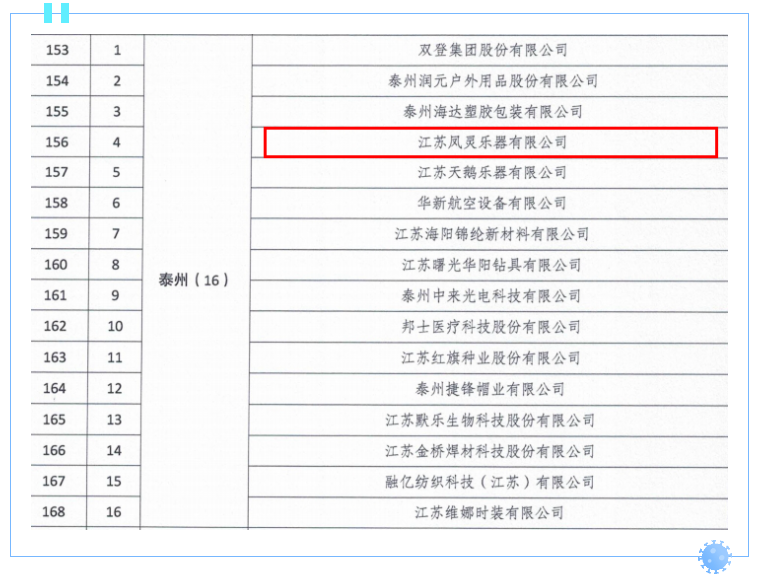 近日,江苏省商务厅公布了第二批内外贸一体化试点企业名单,其中,泰兴市江苏凤灵乐器有限公司上榜。