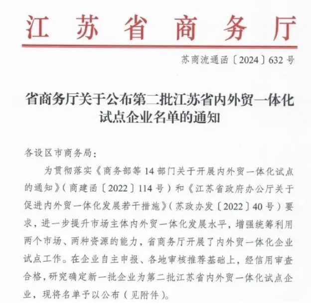 入选江苏省内外贸一体化试点企业须满足一系列条件,包括经营状况良好,经营渠道和营销网络完善;拥有自主研发团队,通过质量管理认证,重视商标保护,获得省市级以上质量、品牌荣誉。内外贸一体化企业试点工作目的是推进重点企业改革创新,形成一些可复制、可推广的经验和模式,进一步增强企业参与国内大循环的内生动力和活跃度,提升企业国际循环的质量和水平。