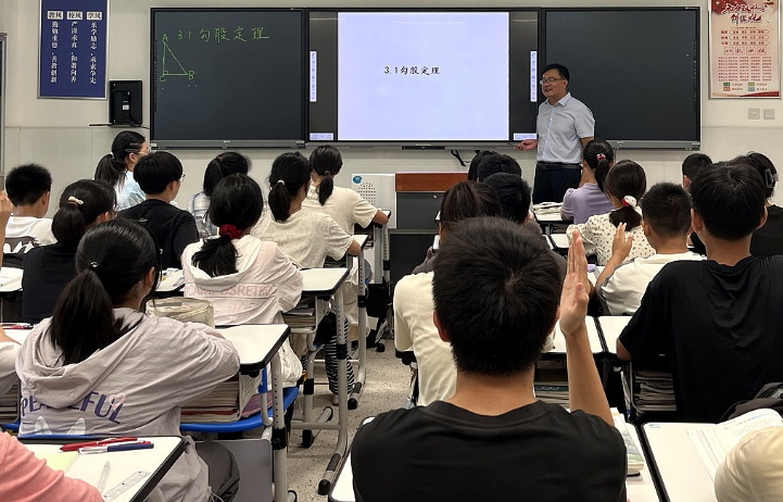10月9日上午,在泰兴市实验初中教育集团文江分校,有着30多年教龄的管旺进正用智慧屏给孩子们上数学课,曾经复杂的数学定理如今能在屏幕上直观呈现推导过程。“过去教学主要依靠黑板、粉笔,无其他技术支持。如今,现代技术构建多元空间,沉浸式、体验式、真实性的场景让学生接受知识更鲜活,学习活动可视化也使教学更生动直观。”泰兴市实验初中教育集团文江分校副校长管旺进感慨道。