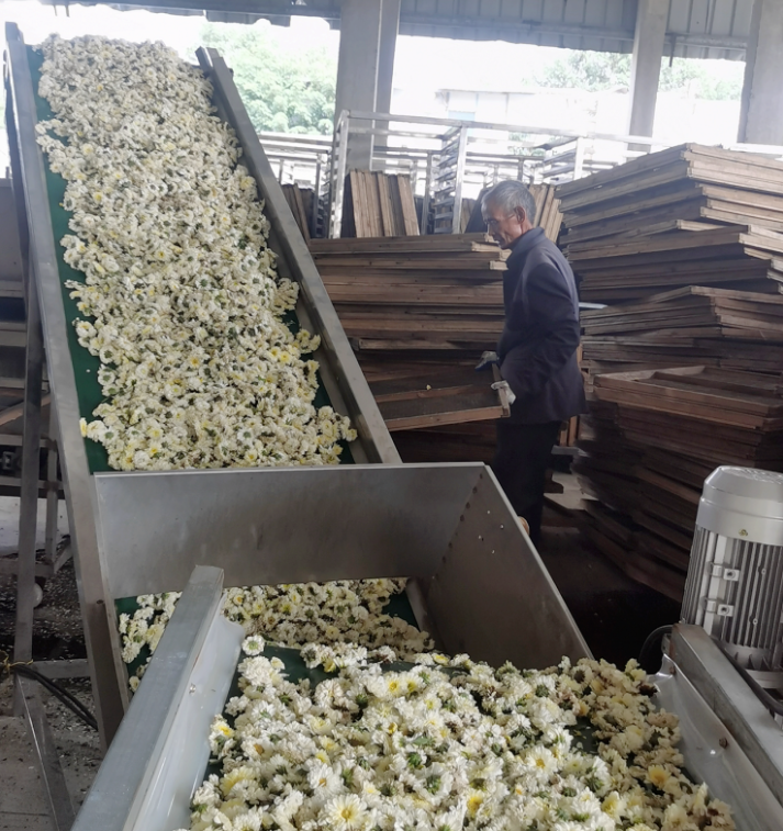 为了延伸菊花产业链,老叶村配套建设了菊花深加工车间,将刚采摘下来的菊花经过杀青、烘干、分拣、装箱等工序后进行销售,进一步提高菊花的产值。