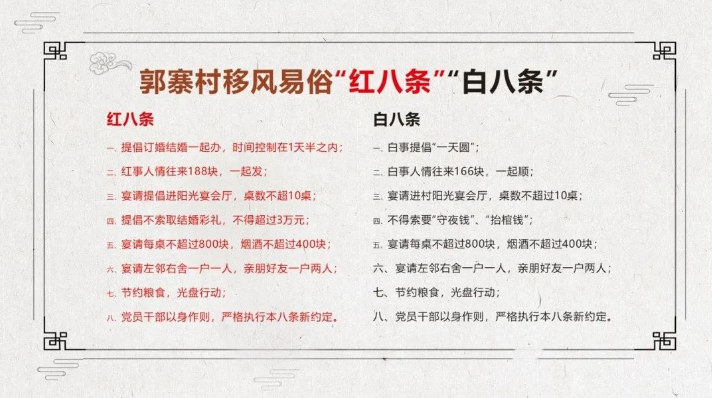 在宣堡镇郭寨村,喜事连连中却透露出不一样的文明风尚。结婚随礼,这一传统风俗在这里有了新的诠释。村里每户人家的红包都不超过200元,甚至有些人家还有零有整。这一变化,得益于村民共同遵守的郭寨村移风易俗“红八条”“白八条”。其中,“红事人情往来188块,一起发”的规定,更是让村民们告别了过去的攀比之风,转向了简约、文明的办事方式。 郭寨村还专门安排了“官方”集中地——宣堡镇郭寨村“阳光宴会厅”,用于举办红白事。2022年,该宴会厅平均每月接待1至2场,年接待人次达到1500人。这一举措,不仅有效遏制了大操大办、铺张浪费的不良习俗,还促进了村民之间的和谐相处。