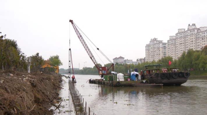 10月16日上午,在如泰运河北侧(文江桥至镇海路段)综合整治项目现场,施工人员正在进行挡墙打桩、挂板施工以及挡墙压顶模板制作。该河段长约700米,过去为块石挡墙,由于建成时间较长,长期受行船波浪冲刷,挡墙多处坍塌。这次整治,将采用方桩、挂板作为基础,同时浇筑钢筋混凝土挡墙。沿河还将新建一条2米宽的健身步道,方便市民观光娱乐。“挡墙施工大约在11月中旬结束,然后进行人行步道施工,力争在11月底全部结束。”项目安全员何爱存说。