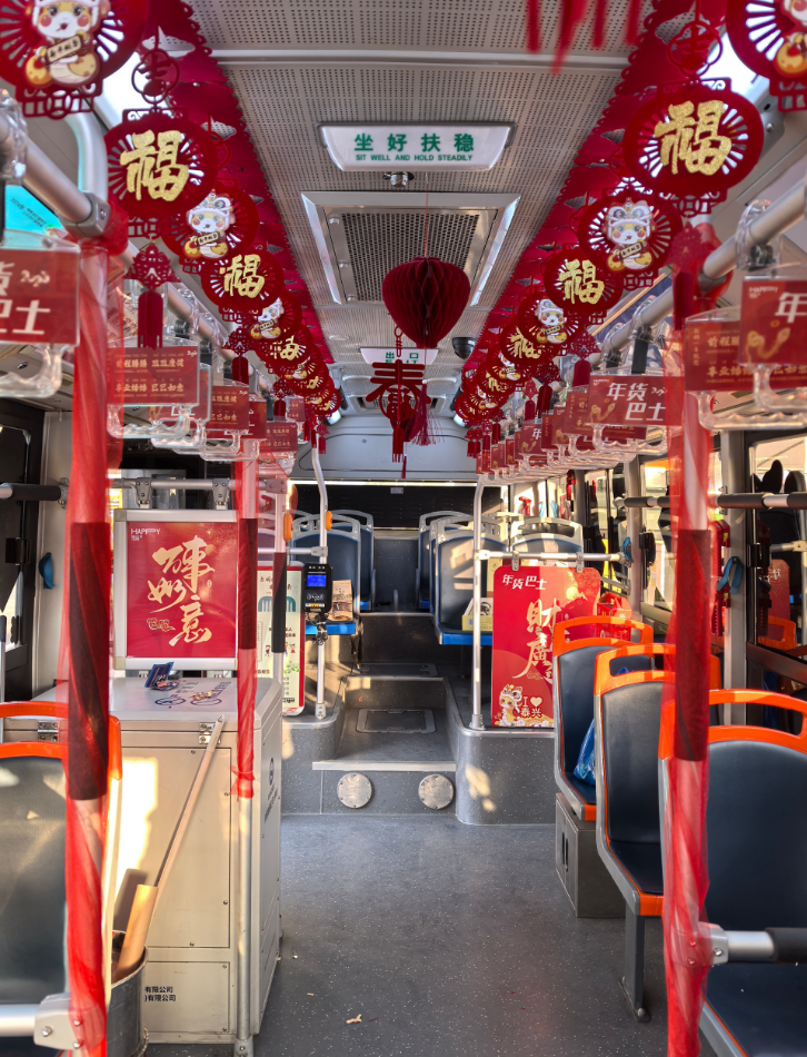 春节期间,在泰兴城区大润发公交站台,一辆公交车特别喜庆,车前“年货巴士”字样尤为醒目,车身两侧有蛇年大吉、福娃送福等主题装饰,车厢内以红色为主进行装扮,“年”味十足。市民蔡桂芳提着刚买的年货喜滋滋地上了车:“家里已经采购了不少年货,我今天特意列了张清单,再来补充一些。而且这车里还有不少我们的土特产,正好给女儿带点回上海。”浓浓的年味中,乘客们相互交谈着,车厢里欢声笑语。