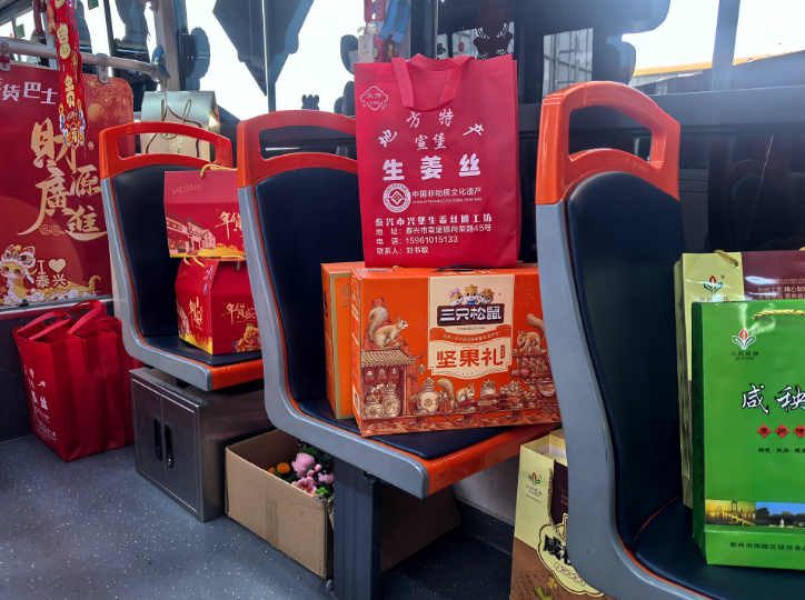 2024年末,泰兴泰通公交公司探索“公交+商贸”新模式,全面布局新媒体领域,构建宣传矩阵,推出“乘公交、游泰兴”系列短视频,全网点击量破20万。“年货巴士”是“乘公交、游泰兴”新年专题项目,主要满足广大群众对价廉物美年货的需求,并提供送货上门服务。依托公交线路覆盖范围广、班次密度高等优势,泰通公交公司与各大供应商洽谈年货产品价格,确保物美价廉。公交车内年货琳琅满目,不仅涵盖了银杏晶、黄桥烧饼、黄桥肉渣、曲霞汤包、宣堡生姜丝等泰兴特产,还有花生、瓜子、开心果等坚果类食品,以及公交员工自己设计制作的精美手工摆件。