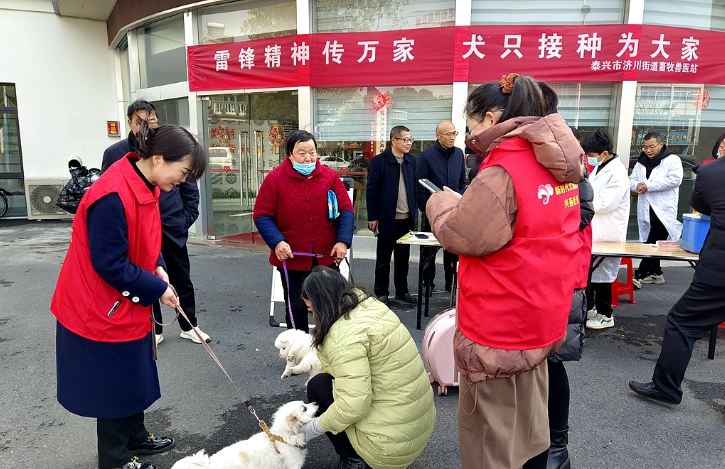 泰兴市畜牧兽医中心党支部从源头开展文明养犬宣传和志愿服务活动,组织党员志愿者前往济川街道兴燕社区,开展“雷锋精神传万家,犬只接种为大家”志愿服务活动。通过发放狂犬病防控宣传页,科普狂犬病等重要人畜共患病防控知识,宣传《中华人民共和国动物防疫法》相关规定,倡导依法养犬、文明养犬。活动现场,工作人员为犬只注射狂犬疫苗并进行免疫登记,筑牢犬只免疫屏障,提升市民文明养犬意识。