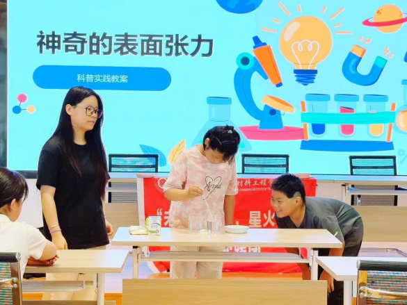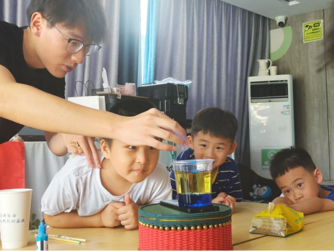 科普化学实验室,动手实践见真章 “纸上得来终觉浅,绝知此事要躬行”。实践团抛弃了传统的课堂模式,不再局限于PPT讲解和静物陈列,而是更注重于将知识与实践结合起来,让“死气沉沉”的知识“活”过来,让孩子们能真正的“看得见,摸得着,学的懂”。成员通过“海底熔岩灯”让孩子们更直观的“看见”二氧化碳,并理解什么是密度差导致分层;通过“水的特性实验”让孩子们知道水的“形状”和溶解性,并培养孩子们节约用水的良好习惯;通过“磁力小车”向孩子们讲解什么是磁场,让他们思考小车为什么突然就动起来了等等。课堂上孩子们目不转睛眼中充满了对知识的好奇与渴望,“我们只想在能力范围内尽最大努力让孩子们领略科学的魅力。”实践团成员说道。 开绿村 吴文昕开展科普实践 北站社区 佘健山开展化学课堂 星光公益咖吧 侯世典开展化学课堂海底熔岩灯