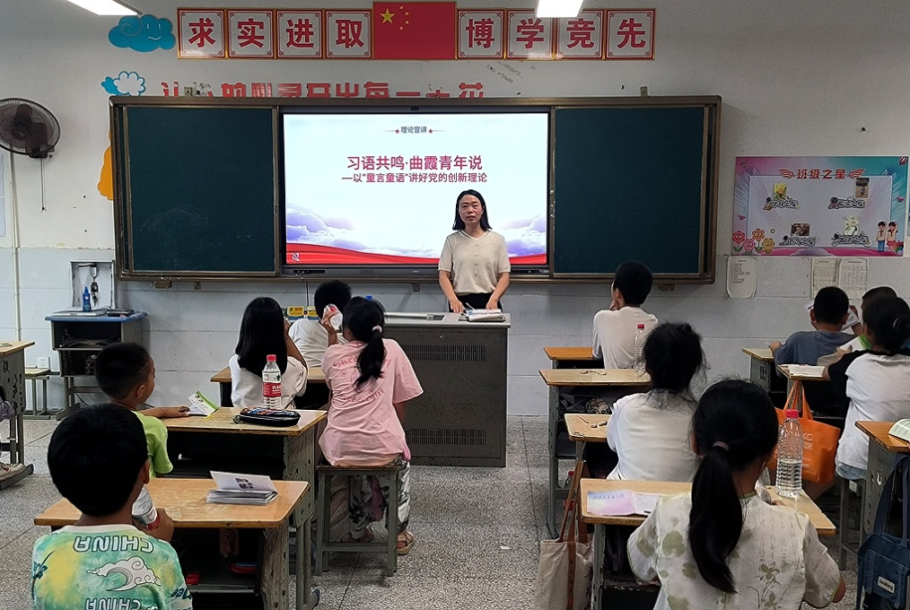 童言童语传党音。“同学们知道什么是‘共同富裕’吗?就像跳绳比赛,跳得快的同学带着跳得慢的一起练……”7月22日,张桥镇中心小学暑托班的“习语共鸣·曲霞青年说”课堂上,90后宣讲员张俊用孩子们熟悉的例子讲解理论概念,孩子们频频举手互动。“我们坚持‘少年儿童在哪里,宣讲就覆盖到哪里;少年儿童喜欢什么,宣讲就创新什么’的原则,用动画、顺口溜把理论翻译成‘童言童语’,让孩子们在快乐中学习。”曲霞镇党委宣传委员周奕欣介绍。