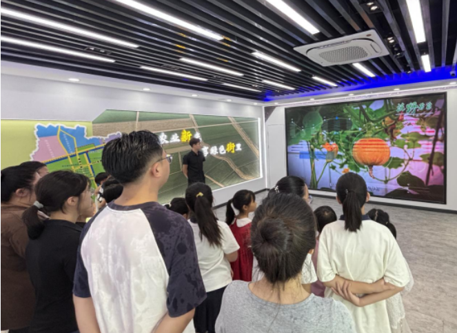 在现代农业展厅的大屏幕前,孩子们和家长们一同观看了新街镇现代农业宣传片,宣传片生动展现了新街镇现代农业的崭新面貌:从传统农耕到智慧管理的飞跃。“大家看,我们的大棚里安装了各种传感器,对阳光、温度、湿度、土壤养分进行实时监测和自动调节。就像给庄稼装上了‘智能管家’,让它们在最舒适的环境里生长。”志愿者介绍道。孩子们纷纷睁大好奇的眼睛,开启现代农业的“探秘之旅”。当巨大的屏幕上出现无人机在田野上空飞翔作业、机械臂自动采摘蔬果的画面时,孩子们发出了阵阵“哇”的惊叹声。
