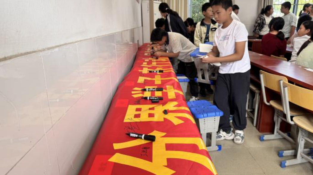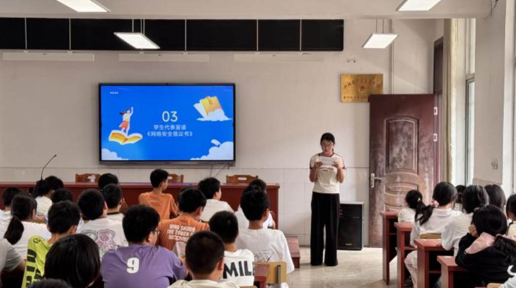 讲座结束后,活动进入宣读《网络安全倡议书》环节。学生代表何雨桐手持倡议书,以铿锵有力的声音,向全体参与同学发出倡议,呼吁大家自觉遵守网络法律法规,树立正确网络价值观,抵制不良网络信息,保护个人信息安全,积极营造健康、文明、安全的网络环境。在老师的引导下,初一年级的同学们郑重地在横幅上签下自己的名字。笔尖落下的不仅是一个个姓名,更是同学们对践行网络安全承诺的坚定决心——承诺将所学的网络安全知识运用到日常上网生活中,主动抵制网络不良信息,守护个人信息安全,带动身边人共同维护健康的网络环境。