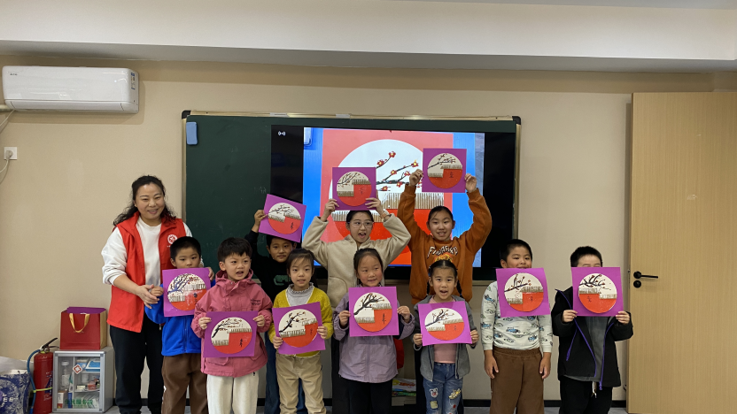 过程中,孩子们互相帮助、尽情发挥——有的细致装饰屋檐,有的用墨色浓淡表现梅枝姿态,还有的认真题写“立冬”字样。志愿者从旁鼓励、协助,现场洋溢温馨与欢笑。完成作品后,孩子们踊跃展示并分享构思,眼中充满成就感。