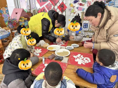 指尖生花,五谷粘福寄愿 “小朋友们,先在五谷颗粒上轻轻涂一点胶,再小心贴到福字上,注意不要把食材放进嘴里哦!”在“五谷粘福”环节,张桥镇星火志愿队志愿者为孩子们发放了福字底卡、五谷食材、胶棒和一次性餐垫,细致示范手工制作步骤,并反复强调安全与卫生要点。孩子们分组围坐,在民政服务站工作人员和幼儿园老师的巡回指导下,充分发挥创意:有的用红豆勾勒福字轮廓,有的用绿豆、小米搭配出别致图案,动手能力较弱的小朋友也在一对一帮扶下逐步完成作品。现场欢声笑语不断,孩子们专注地粘贴每一粒五谷,指尖翻飞间,一幅幅色彩斑斓、充满童趣的五谷福字逐渐成型,既锻炼了动手能力,又寄托了对生活的美好期许。