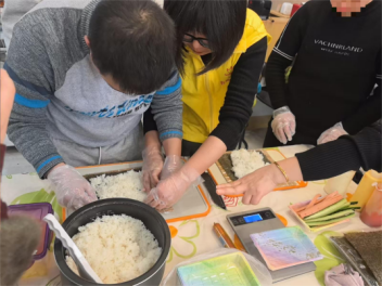 寿司手作时光 感受创造的喜悦 技能培训结束后,寿司老师的到来为活动增添了更多趣味。老师先向孩子们介绍寿司的起源与食材知识,随后展示卷帘寿司的制作步骤,从米饭的铺展、食材的搭配到卷制力度的掌控,每一个细节都耐心示范、细致讲解。“米饭要铺得薄而均匀,不然卷的时候会散开”“黄瓜和胡萝卜要切得粗细一致,这样口感更好”,孩子们围在桌前认真倾听,眼神中充满期待。 实操环节中,孩子们在老师和志愿者的手把手指导下,小心翼翼地铺米饭、放食材、卷卷帘,虽然动作略显笨拙,但每个人都格外专注。有的孩子反复练习卷制技巧,有的孩子创意搭配食材,现场欢声笑语不断。当一个个形态各异的寿司完成时,孩子们脸上洋溢着满满的成就感,主动将自己的作品分享给同伴和老师,在分享中感受合作的温暖与成功的喜悦。老师对每个孩子的作品都给予肯定与点评,引导他们珍惜食物、享受劳动成果。