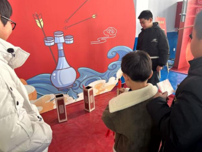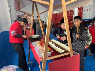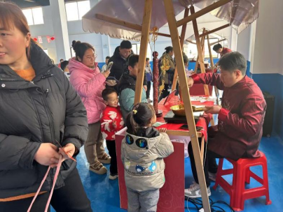 室外游园活动现场,专为未成年人设计的体验项目人气爆棚。“非遗迎春”体验区里,非遗传承人手把手指导孩子们画糖画、剪窗花,一笔一划勾勒传统韵味;村书法爱好者挥毫泼墨,为孩子们送上定制春联与福字,让传统文化在指尖流转。“趣味游艺”互动区成为孩子们的欢乐天地,《幸运大转盘》游戏中,孩子们转动转盘应答党的二十届四中全会知识、春节习俗、党史知识等题目,在答题闯关间增长见识;《福到我家》项目里,小朋友两两协作,掌心相对紧握福字穿越障碍,在默契配合中培养团队精神,获胜者收获的新春冰箱贴等小奖品,让喜悦翻倍。此外,“健康惠民”服务区的医护人员为孩子们普及冬季流感预防知识,“文明新风” 宣传区通过“绿书签”发放、反诈防骗讲解,引导青少年树立健康成长理念。