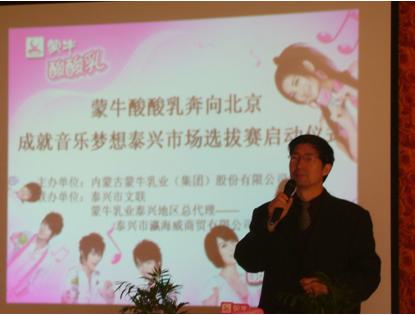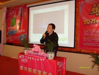 2008年4月24日下午4点,蒙牛乳业泰兴总代理——泰兴市瀛海威商贸有限公司在泰兴市广电中心召开了2008年蒙牛酸酸乳“奔向北京·成就音乐梦想”选拔赛新闻发布会,此次新闻发布会的召开也标志着2008年蒙牛酸酸乳“奔向北京·成就音乐梦想”选拔赛路演在泰兴全面的展开。