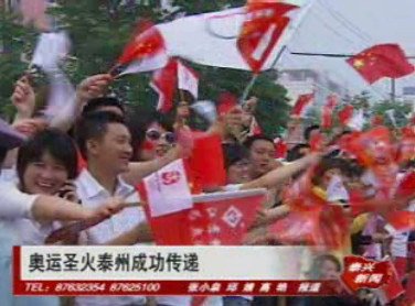 2008北京奥运圣火江苏境内传递活动5月26日到达泰州。上午,北京奥委会、江苏省、泰州市有关领导、社会各界3000多人出席了圣火传递活动,泰州市市委书记张雷致辞。 火炬接力开始前,全体与会者向汶川大地震遇难者默哀一分钟。为支援灾区,与会领导、观众代表和部分企业代表向灾区捐款。泰州市市委书记张雷在致辞中说:“奥运圣火一路走来,传递着光明和关爱,凝聚着团结和力量,播洒着梦想和希望。此时此刻,我们更加挂念灾区群众,500万泰州人民将继续和千万灾区人民一起,和亿万华夏儿女一起,守望、相助,携手并肩,共创未来。”