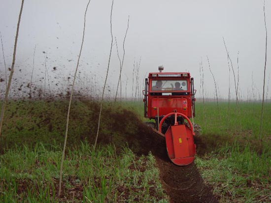 图四为外地能人张勤正在新栽的意杨林内开挖降水沟,确保江潮过后,林地不发生渍害。