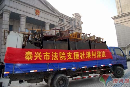 (特约记者 尹明生 胡玲)12月23日,为改善扶贫村根思乡杜港村办公条件,泰兴法院精心组织,为扶贫村捐献一批桌椅板凳等硬件设施,此举受到杜港村干部、群众的一致好评。
