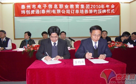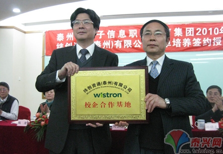 (特约记者 季文才 谢道权)近日,泰兴中等专业学校与纬创资通(泰州)有限公司在昆山举行了隆重的订单培养签约和授牌仪式。 纬创资通(泰州)有限公司是由台湾纬创集团在泰州经济开发区内总投资10亿美元设立的,主要从事笔记本电脑生产及销售。该项目建成后,可直接创造5万个以上的就业岗位,全部达产后产值将突破1000亿元。根据协议,学校今年秋学期将开设“纬创班”。在三年学制内,第一年,“纬创班”学生根据纬创用工需求在校学习相关内容。第二年,学生到纬创公司采用工学结合方式,实行半工半读,学校还将派老师和学生一起进厂,将课堂直接开到车间。其间,学生除了获得一定的工资之外,每年纬创还将拿出资金奖励优秀学生。 此次合作将促进学校人才培养和办学模式的改革,不断提升教育教学质量,推进校企合作和工学结合实训基地建设。 |