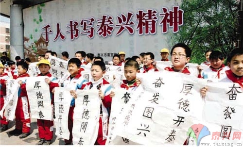 为进一步提高新时期泰兴精神的知晓率、认同度,4月24日上午,我市举行千人书写“泰兴精神”活动,市领导戴仁泉、王中先、杨晋安、张春山出席。 在鼓楼文化广场,1000多名小学生现场挥毫,书写“厚德开泰 、奋发图兴”的新时期泰兴精神。 市委常委、宣传部部长戴仁泉指出,这次活动是全市深入开展泰兴精神宣传实践活动的一个具体行动,他希望参与活动的学生们充分发挥“小手拉大手”的作用,推动泰兴精神的学习、宣传、实践,进家庭、进校园、进社区,进而在全社会形成弘扬、践行泰兴精神的浓厚氛围。 在一张张白纸上,孩子们写下了各种书法字体的“厚德开泰、奋发图兴”,字里行间渗透着孩子们对泰兴精神的理解,对家乡的热爱。 |