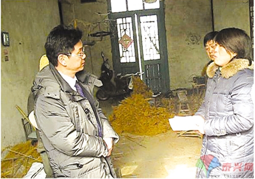 前几年,张湾村4组王薇的丈夫去世,正在上大学的儿子又不幸脑出血,本来贫困的家庭又欠下了30多万元的住院费。图为江苏宝银投资有限公司员工受黄胜的委托,将爱心钱和物品送到她的家中。