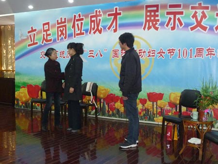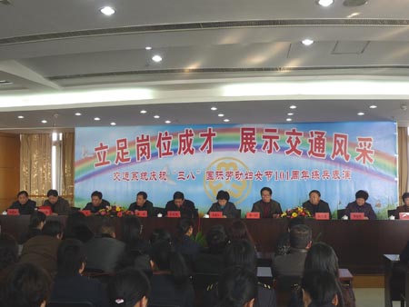 来自市汽车运输总公司、江平线泰兴口岸收费站、泰通公交公司、浩通七圩汽渡等单位的职工声情并茂地表演了《爱心使者》、《醉汉逃费记》、《风雪大年夜》等6个节目,真实地再现了交运系统广大女职工自尊、自信、自立、自强的精神风貌。 活动开始之前,交运系统还对妇女工作先进集体和个人进行了表彰。 |