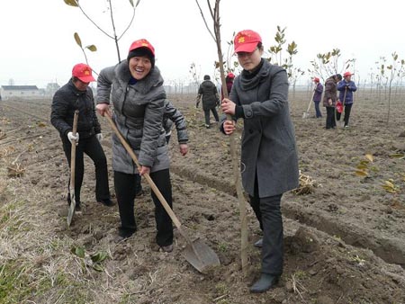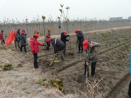 当天下午,女义工队员们来到广陵镇木行村,在相关人员的指导下,定好间距,开挖树坑,放苗、填土、踩实……一丝不苟,忙个不停。在大家的共同努力下,栽下的树苗排列整齐,错落有致,迎风挺立,成为一道美丽的风景。