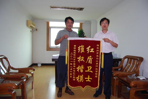 8月15日,黄桥镇村民常守军代表10位种植户给泰兴工商局送来了“红盾卫士、维权楷模”的锦旗。