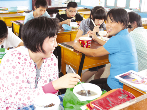8时,殷亚平跟着学生一起走进课堂,其实今天上午她没有上课任务。同事小张告诉记者:“她就是没课也不会闲着,会坐在教室的最后面听课,直到放学。”殷亚平说,这样既可以增加对学生其它学课成绩的了解,督促上课不自觉的学生专心听课,又可以拓宽自己的知识面,更好地辅导学生全面进步。殷亚平发明的“听课管理”法,被全校老师效仿。 每天中午,殷亚平都不回家,因为班上有6名留守儿童。上午第三节课结束后,她会主动到校门口把6名学生家人送来的饭菜,接到学校饭堂热好后再端到教室,然后自己泡上一碗方便面和学生们边吃边聊。