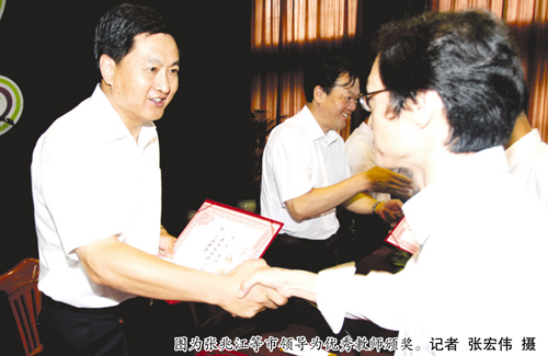 9月10日是全国第27个教师节。上午,市委书记张兆江、市长高亚梓,市领导张国祥、陈培才、周桂香、张春山来到省泰兴中学,参加学校教师节庆祝大会,与教师一起欢度节日。 张兆江首先代表市委、市人大、市政府、市政协向全市广大教育工作者致以节日的问候和崇高的敬意。 张兆江指出,新的形势和任务对全市广大教师提出了新的更高的要求。他对全市的教育工作者提出四点希望:一要牢记使命,使爱岗敬业成为自觉追求;二要为人师表,使高尚师德成为立身之本;三要终身学习,使精益求精成为实际行动;四要关爱学生,使育人成才成为不懈追求。 张兆江要求,各级党委政府、教育主管部门要积极作为,把教育事业作为基础性、先导性、全局性的工作抓紧抓细抓实;要把教师队伍建设纳入到全市人才工作的总体战略中统筹考虑;要努力培育尊师重教的良好风气。 庆祝大会上,张兆江、高亚梓、张国祥、陈培才、周桂香、张春山还为泰兴中学15名优秀教师颁奖。 |