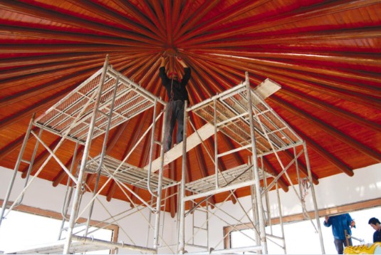 图为工作人员正在对农场最大单体餐厅进行装修。