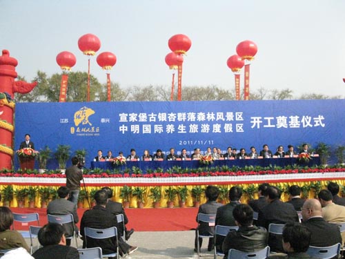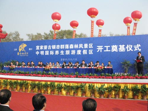 11月11日上午,我市举行宣家堡古银杏群落森林风景区暨中明国际养生旅游度假区开工奠基仪式。国家、省市有关部门负责人,泰州市副市长廖涛、我市市委书记张兆江、市长高亚梓及部分市四套班子负责人参加了开工奠基仪式。