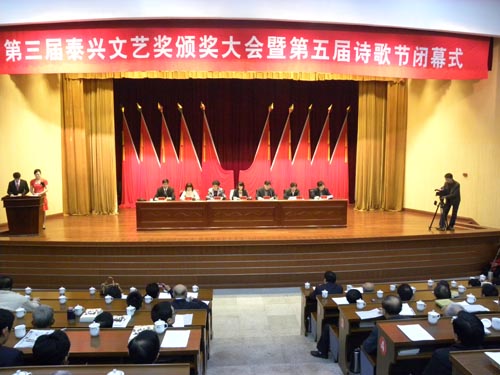 (记者 孙纪刚)11月19日下午,我市举行第三届泰兴文艺奖颁奖大会暨中国(泰兴)银杏之乡第五届诗歌节闭幕式,表彰奖励最近4年来为我市文艺的繁荣发展而辛勤耕耘的先进个人,充分展示五届诗歌节的丰硕成果。市委常委、宣传部部长张国祥,副市长周桂香,政协副主席张春山,泰州市文联副主席俞秋言以及我市文联负责同志出席颁奖大会并为获奖的文艺工作者颁奖。 泰兴文艺奖设立于2003年,是我市文艺界的最高奖项,也是市委、市政府繁荣我市文艺事业,推进文化强市建设的一项重要举措,更是市委、市政府对文艺工作高度重视,对文艺界人士尊重、爱护的生动体现。前两届文艺奖的评选,极大地激发了我市文艺工作者的创作激情,产生了良好的影响。